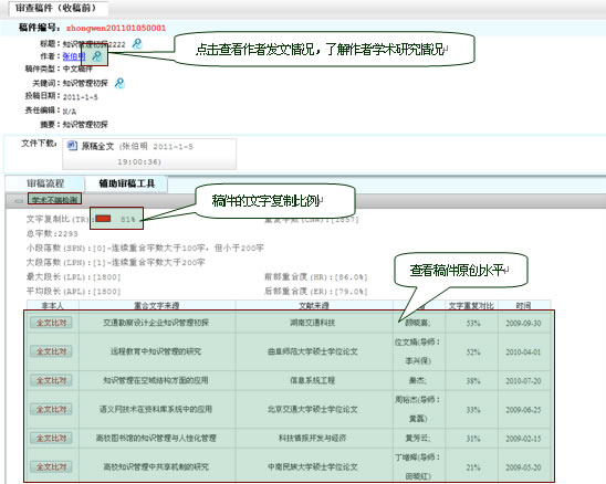 点击稿件标题,可以查看稿件的详细信息;点击作者姓名,可以查看作者的详细信息。 另外,为了便于对稿件和人员进行操作,系统把对稿件和人员的一些常用操作整合成菜单,点击稿件标题和人员姓名右侧的黄色箭头,可以看到菜单,如图示: