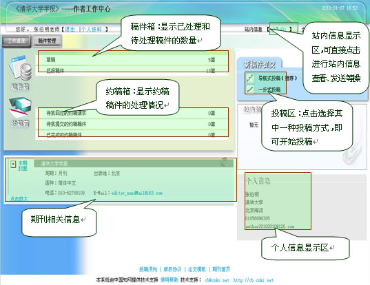 • 作者工作界面包括“工作桌面”和“稿件管理”。“工作桌面”能够直观地反映作者当前待处理的工作信息;“稿件管理”则能直观地反映作者的稿件信息。