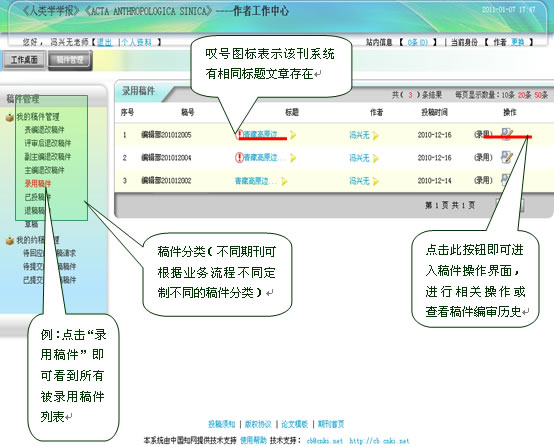 • 以《人类学学报》杂志的作者用户稿件管理界面为例: